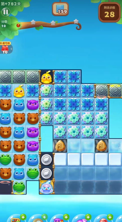 利用特效组合进行大规模清屏是突破此关中部障碍的核心方法。当通过初始操作制造出如两个魔力鸟这样的强力特效时,应立即将它们交换以达成全屏幕消除。这次清屏能有效地打开被封锁的主要区域,特别是左上和下方的空间,让动物得以填充并为后续消除创造条件。空间打开后,应优先激活和围绕魔法石进行消除,利用其连锁攻击的特性清理右侧区域的雪块。在此期间,场面上应尽量制造直线特效与爆炸特效的组合,并利用连消来持续积累分数和推进进度。